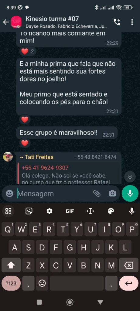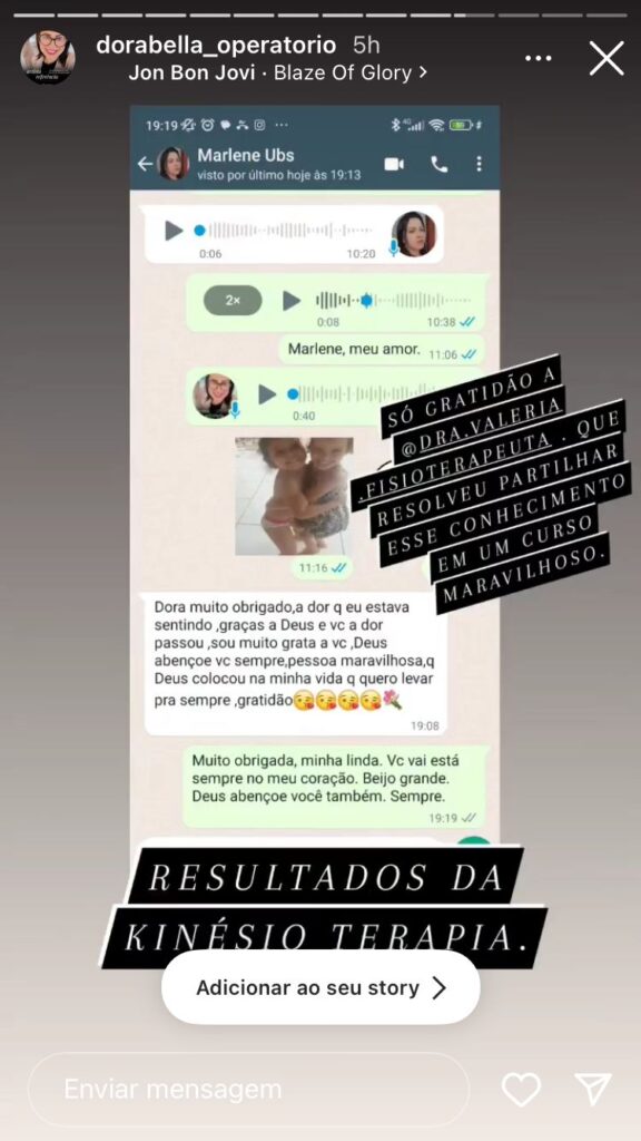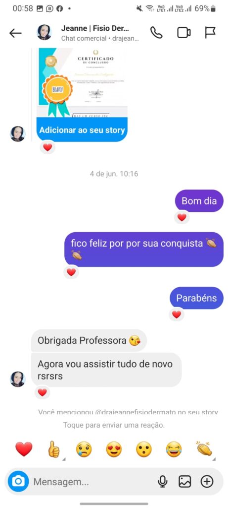 Essa aluna postou uma conversa com sua paciente, que agradeceu pelos os resultados proporcionados pelas técnicas que a aluna aprendeu comigo.