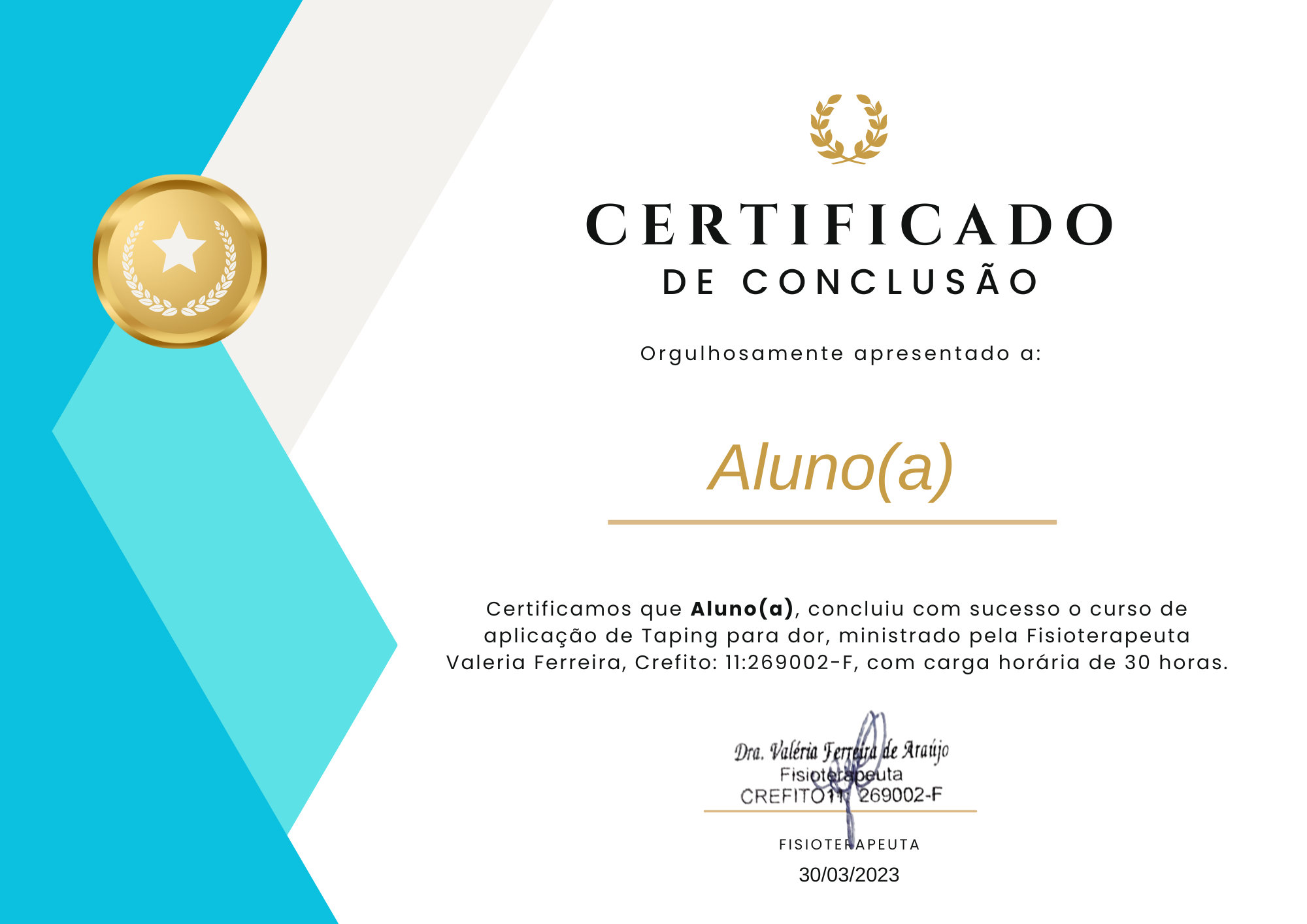Sim, você rebeberá um certificado autenticado e válido em todo território nacional de 30 horas para o curso de Taping na dor Musculoesquelética. Assinado e carimbado por mim (Valéria Ferreira – Fisioterapeuta, Crefito: 11:269002-F).